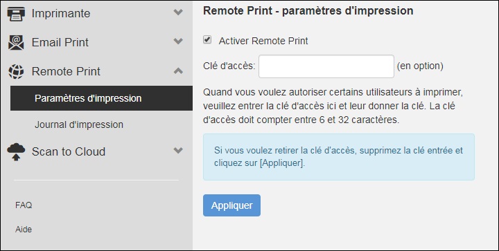 Remarque : Vous pouvez choisir d’assigner une clé d’accès pour autoriser seulement certains utilisateurs à imprimer avec Remote Print.