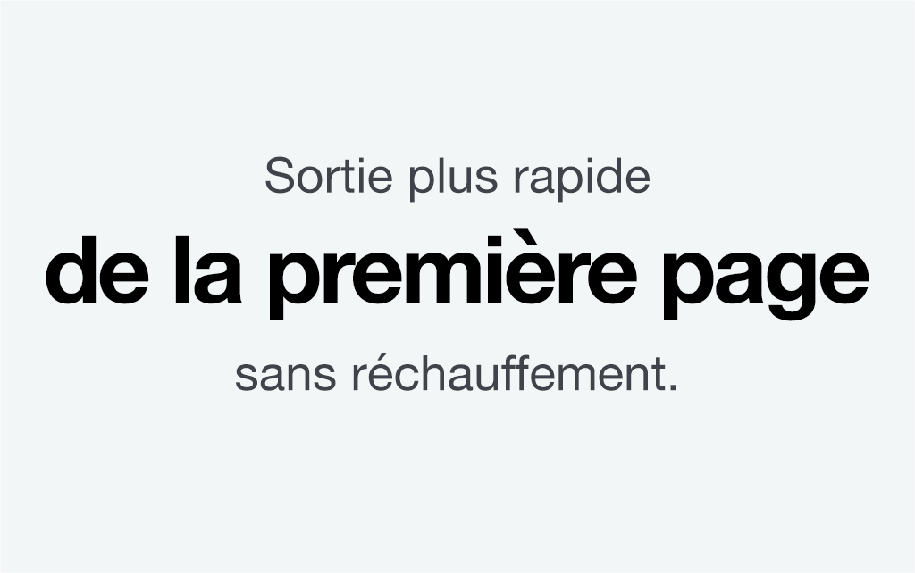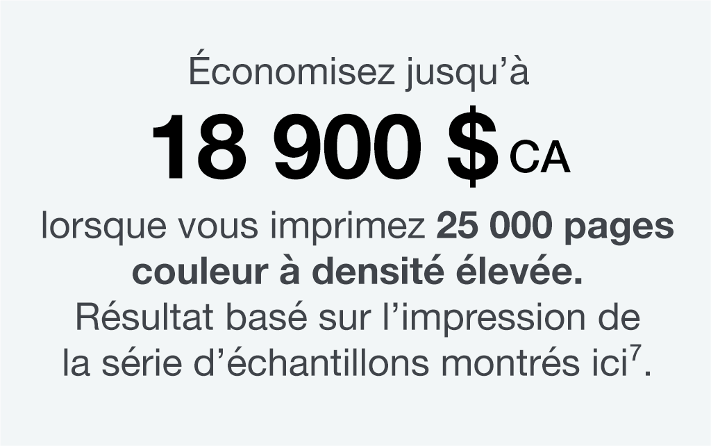 2 Les économies réelles peuvent varier considérablement en fonction des tâches et des volumes d’impression ainsi que des conditions d’utilisation. Les économies et les coûts par page ISO sont fondés sur le coût des bouteilles d’encre de rechange et celui d’un nombre suffisant de cartouches de toner couleur de capacité standard pour imprimante laser pour obtenir le rendement total d’impression des bouteilles en fonction des prix de détail en ligne des fabricants et des rendements des imprimantes laser couleur dotées de caractéristiques semblables les plus vendues, offertes en vente libre, dont le prix est inférieur ou égal à 2 000 $ CA et dont la vitesse d’impression est inférieure ou égale à 40 pages par minute d’après les données disponibles dans le secteur en date de décembre 2021. Les économies pouvant atteindre 700 $ CA et les coûts par page ISO d’environ 0,11 $ CA pour des cartouches de toner couleur de très grande capacité pour imprimante laser ont été déterminés selon la même méthode.