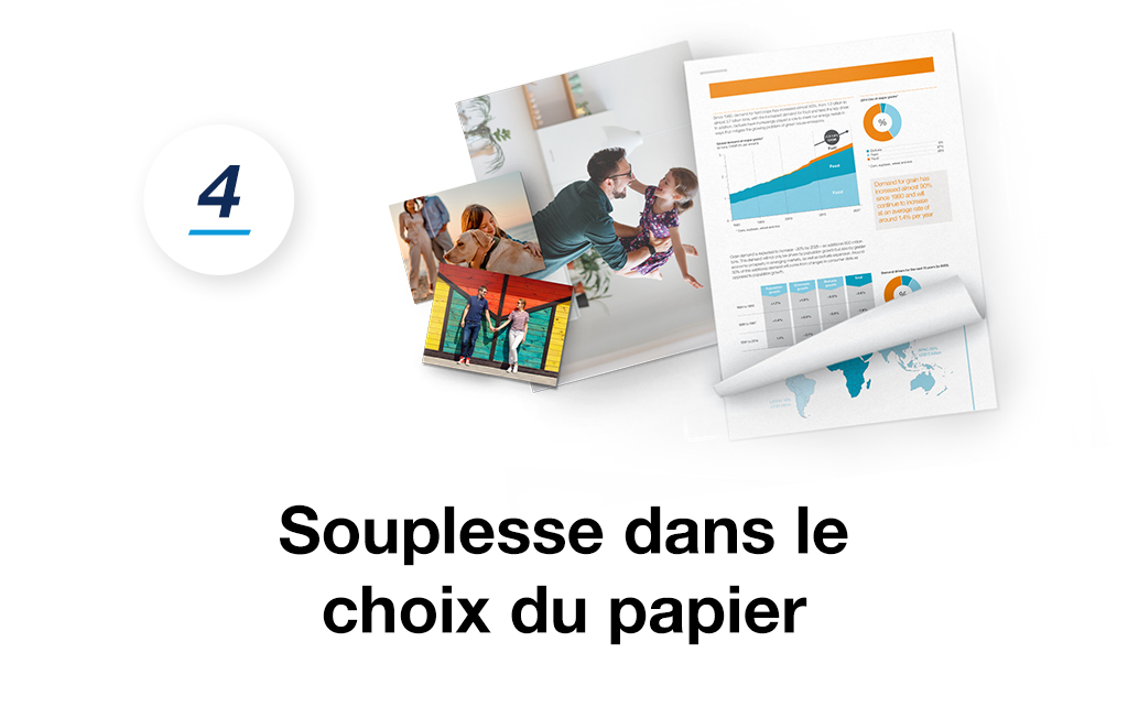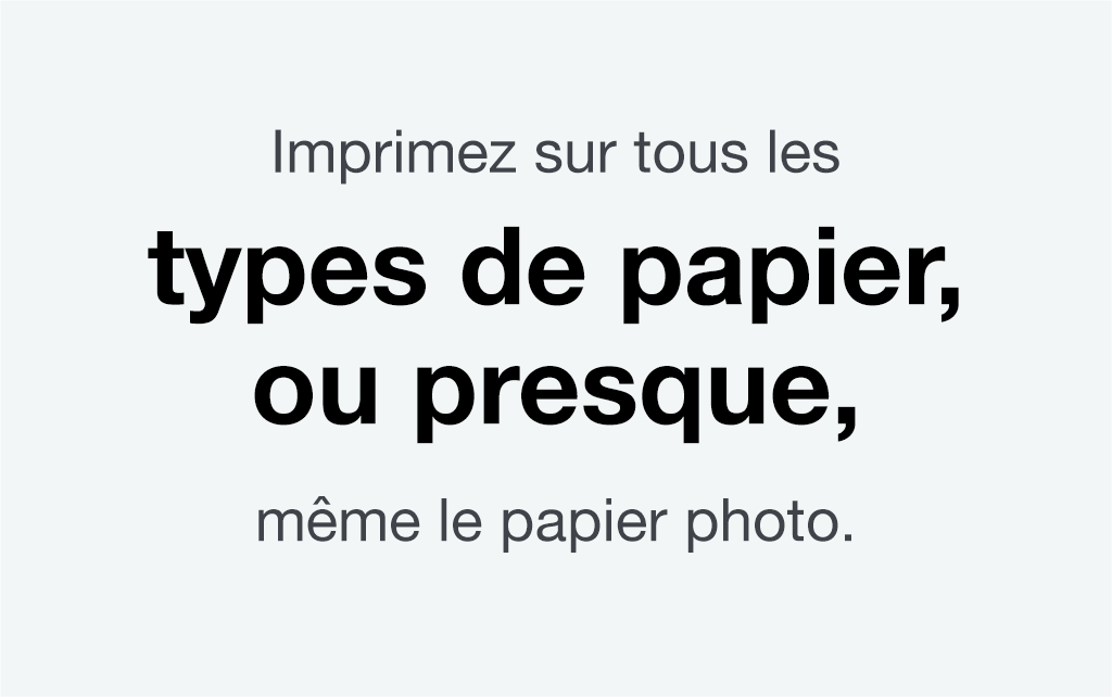 Imprimez sur une vaste gamme de papiers, depuis les simples papiers de photocopie jusqu’aux papiers photographiques et papiers cartonnés épais. Vous pouvez même imprimer des documents allant jusqu’à 13 x 19 po avec nos modèles grand format.