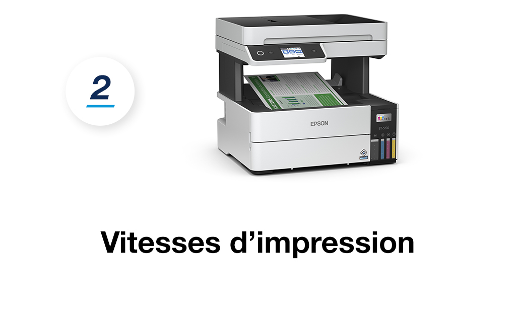 † Les vitesses d’impression en noir et en couleur sont déterminées conformément à la norme ISO/IEC 24 734. Le temps d’impression réel varie selon la configuration du système, le logiciel et la complexité des pages. Pour en savoir plus, visitez la page www.epson.ca/printspeed.
