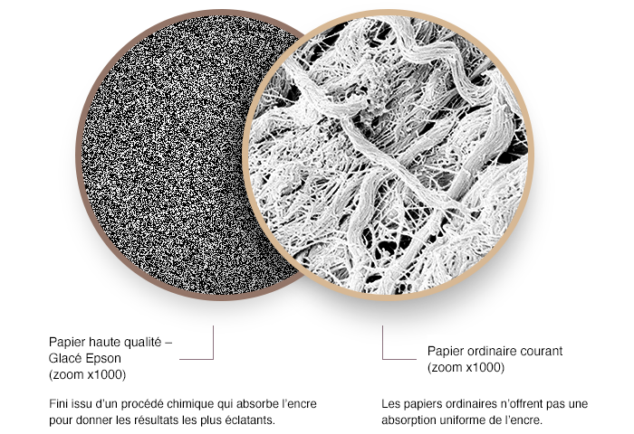 Les papiers spéciaux Epson présentent de quatre à huit couches par feuille. Ces couches absorbent l’encre, fixent les couleurs vives et vous donnent des impressions de qualité supérieure à séchage instantané. Voyez la différence entre le papier photo glacé Premium Epson et un papier ordinaire courant.