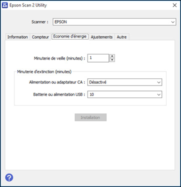 Vous pouvez utiliser Epson Scan 2 Utility pour modifier le délai avant que le scanner n'entre en mode veille et ne s'éteigne automatiquement.- Effectuez l'une des étapes suivantes pour accéder à Epson Scan 2 Utility :