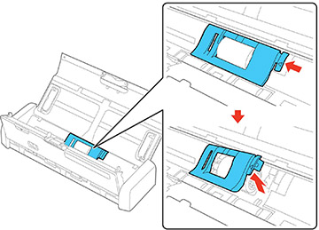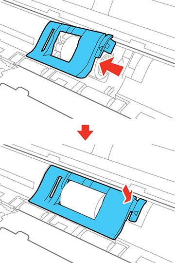 - Alignez le bord gauche du capot du rouleau d'entraînement dans les encoches tel qu'illustré et appuyez vers le bas jusqu'à ce qu'il s'enclenche.