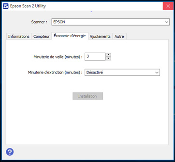Vous pouvez utiliser Epson Scan 2 Utility pour modifier le délai avant que le scanner n'entre en mode veille et ne s'éteigne automatiquement.- Effectuez l'une des étapes suivantes pour accéder à Epson Scan 2 Utility :