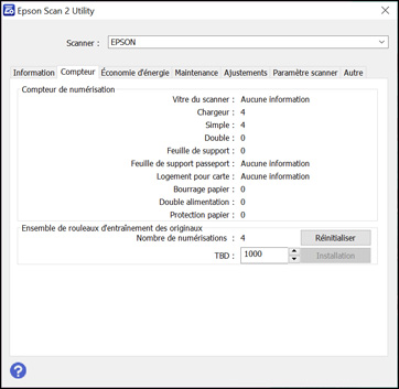 Lorsque vous remplacez les rouleaux du scanner, réinitialisez le compteur des rouleaux du scanner afin de pouvoir déterminer lorsqu'il est nécessaire de remplacer les rouleaux de nouveau.