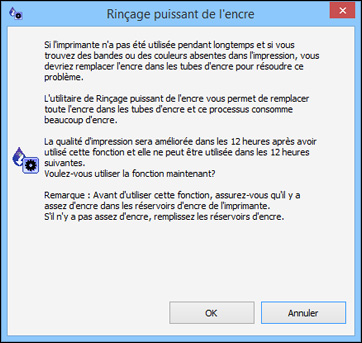Vous pouvez lancer l'utilitaire Rinçage puissant de l'encre pour rincer l'encre.Remarque : Après avoir effectué un rinçage de l'encre, vous devez éteindre le produit et attendre au moins 12 heures avant d'imprimer à nouveau.