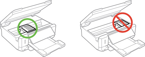 Ne déplacez pas la tête d'impression à la main, sinon, vous risquez d'endommager votre produit. Ne touchez pas au câble plat blanc à l'intérieur de l'imprimante. - Vérifiez si les cartouches d'encre sont dans la position de remplacement de l'encre au centre de l'imprimante. Si ce n'est pas le cas, fermez l'unité du scanner et répétez les étapes 2 et 3.