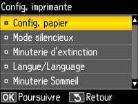 - Appuyez sur le bouton fléché du haut ou du bas pour sélectionner Config. imprimante et appuyez sur le bouton OK. L'écran suivant s'affiche :