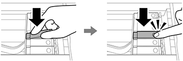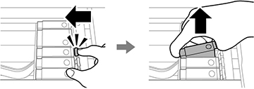 Ne déplacez pas la tête d'impression à la main ou n'utilisez pas d'outil pour retirer la cartouche, sinon, vous risquez d'endommager votre produit. - Appuyez sur la languette de la cartouche et tirez la cartouche vers le haut pour la sortir de l’imprimante.