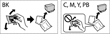 - Si vous remplacez la cartouche d'encre noire, secouez doucement la nouvelle cartouche d'encre noire quatre ou cinq fois. Ne secouez pas les autres cartouches d'encre de couleur. Ensuite, retirez la cartouche de son emballage.