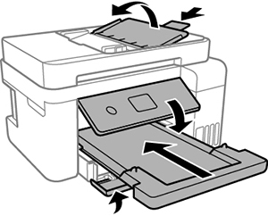 - Fermez le support et l'extension du plateau de sortie du chargeur automatique de documents. Glissez le plateau de sortie dans le produit, fermez le capot avant et abaissez le panneau de commande.