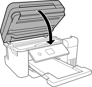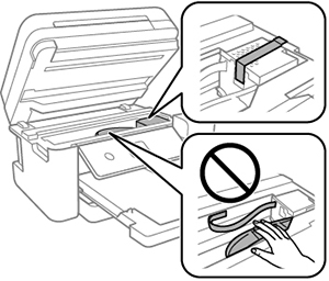 - Soulevez l'unité du scanner et vérifiez que la tête d'impression se trouve complètement à droite (en position de repos). Au besoin, mettez le produit sous tension, attendez que la tête d’impression retourne en position de repos complètement à droite, puis mettez le produit hors tension de nouveau.