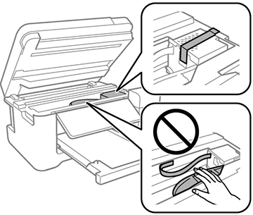 - Soulevez l'unité du scanner et vérifiez que la tête d'impression se trouve complètement à droite (en position de repos). Au besoin, mettez le produit sous tension, attendez que la tête d’impression retourne en position de repos complètement à droite, puis mettez le produit hors tension de nouveau.