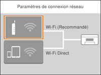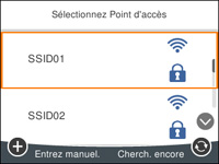 Vous pouvez sélectionner ou modifier les paramètres de réseau sans fil en utilisant le panneau de commande du produit.Pour connecter votre produit à un réseau sans fil, suivez les instructions sur l'affiche Point de départ et installez les logiciels nécessaires en les téléchargeant sur le site d'Epson. Le programme d'installation vous guidera à travers la configuration réseau.