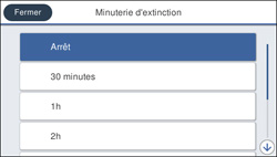Vous pouvez faire en sorte que le produit s'éteigne automatiquement s'il n'est pas utilisé pendant une certaine période de temps.Remarque : Ce paramètre peut être verrouillé par un administrateur. Si vous n'arrivez pas à accéder à ce paramètre, contactez votre administrateur.