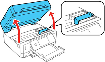 - Soulevez l'unité du scanner et vérifiez que le support de cartouches d’encre se trouve complètement à droite (en position de repos). Au besoin, mettez le produit sous tension, attendez que la tête d’impression retourne en position de repos, puis mettez le produit hors tension de nouveau.