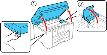 - Soulevez l'unité du scanner jusqu'à ce qu'elle s'enclenche, puis ouvrez le couvercle des cartouches d'encre.