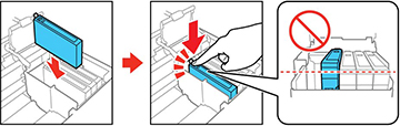 Ne touchez pas aux zones illustrées ici. Sinon, vous risquez de compromettre l'impression et le fonctionnement normal de l'imprimante. Ne retirez aucune étiquette ni ruban d’étanchéité, sinon la cartouche d'encre risque de fuir ou de devenir inutilisable. - Après avoir retiré toutes les cartouches d'encre, réinsérez-les une par une. Appuyez sur chaque cartouche d'encre vers le bas jusqu'à ce qu'elle s'enclenche.