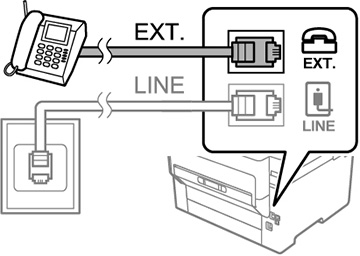 Vous devez connecter votre produit à une prise téléphonique murale pour envoyer ou recevoir des télécopies. Si vous voulez utiliser la même ligne téléphonique pour recevoir des appels, vous pouvez connecter un téléphone ou un répondeur à votre produit en utilisant un câble téléphonique supplémentaire.Remarque : Si vous ne branchez pas de téléphone au produit, assurez-vous que le Mode réception est réglé sur Auto. Autrement, vous ne pourrez pas recevoir de télécopies.