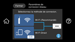 Wi-Fi affichée à l'écran ACL indique l'état de votre connexion sans fil. Si le produit n'est toujours pas connecté au réseau, répétez ces étapes et essayez d'établir la connexion à nouveau. Si vous imprimez depuis un ordinateur, assurez-vous que vous avez installé les logiciels réseau tel que décrit sur l'affiche Point de départ.