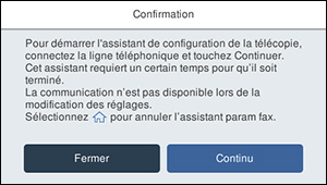 2. Sélectionnez Param. > Paramètres généraux > Param. fax > Assistant param fax. Un écran comme celui-ci s'affiche :