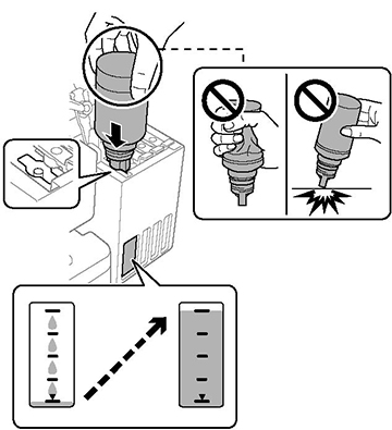 - Attendez que l'encre remplisse le réservoir. Ne pressez pas la bouteille. L'encre s'écoule dans le réservoir et s'arrête automatiquement une fois le réservoir rempli jusqu'à la ligne supérieure.