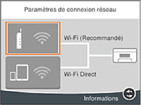 Wi-Fi affichée à l'écran ACL indique l'état de votre connexion sans fil. Si votre produit n'est pas connecté au réseau, il est possible que vous ayez sélectionné le mauvais nom de réseau (SSID) ou saisi le mauvais mot de passe. Répétez ces étapes pour essayer de nouveau. Si vous imprimez depuis un ordinateur, assurez-vous que vous avez installé les logiciels réseau tel que décrit sur l'affiche Point de départ.