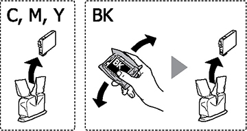 - Si vous remplacez la cartouche d'encre noire, secouez doucement la nouvelle cartouche d'encre noire quatre ou cinq fois. Ne secouez pas les cartouches d'encre de couleur.