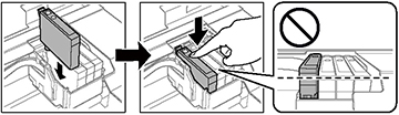 Ne retirez aucune autre étiquette ni aucun ruban d’étanchéité, sinon la cartouche d'encre risque de fuir ou de devenir inutilisable. - Placez la cartouche neuve dans son logement et appuyez dessus jusqu’à ce qu’elle s’enclenche.