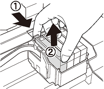Ne déplacez pas la tête d'impression à la main, sinon, vous risquez d'endommager votre produit. Ne touchez pas au câble blanc plat ou à la pellicule translucide à l'intérieur du produit. - Appuyez sur la languette de la cartouche et tirez la cartouche vers le haut pour la sortir de l’imprimante. Si vous ne pouvez pas retirer la cartouche d'encre, tirez-la fermement vers le haut.