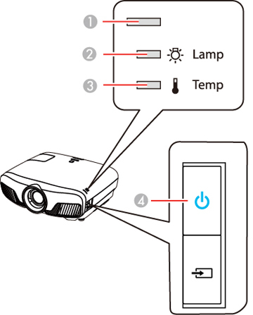 1 Témoin d'état 2 Témoin Lamp 3 Témoin Temp 4 Témoin d'alimentation Témoin d'alimentation Témoin d'état Témoin Lamp Témoin Temp État et solution Bleu Bleu Éteint Éteint Fonctionnement normal. Bleu Clignotant bleu Éteint Éteint Réchauffement en cours; attendez que l'image s'affiche. Mise hors tension en cours; lorsque le témoin d'état cesse de clignoter, vous pouvez débrancher le projecteur. Éteint Éteint Éteint Éteint En mode attente ou en mode veille. Bleu Varie Éteint Clignotant orange Le projecteur est trop chaud. - Vérifiez si les évents et le filtre à air sont obstrués par de la poussière ou par des objets à proximité.
