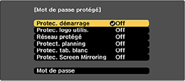 - Appuyez sur la flèche du bas pour sélectionner Mot de passe, puis appuyez sur Enter. Le message « Changer le mot de passe? » s'affiche.