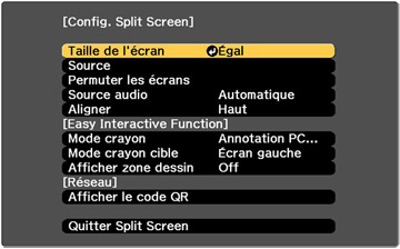Remarque : Si vous utilisez la fonction d'écran divisé, il est possible que d'autres fonctions du projecteur ne soient pas disponibles et certains paramètres pourraient être appliqués automatiquement aux deux images.