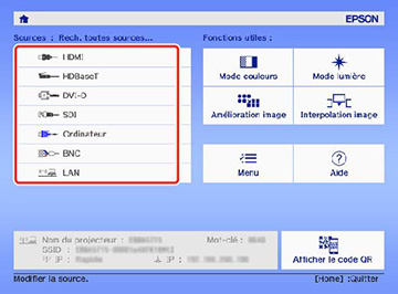 Remarque : Si le paramètre Rech. source auto du menu Avancé est activé, le projecteur passera automatiquement à une autre source d'image détectée si le signal de la source d'image actuelle est perdu.