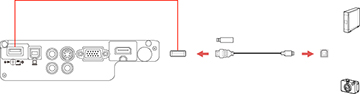 - Branchez le câble USB (ou la clé USB ou le lecteur de carte) au port USB-A du projecteur.