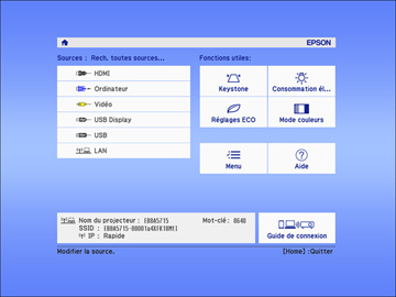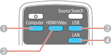 1 Sources du port Computer 2 Sources Video, HDMI et MHL 3 Sources du port USB (affichage de l'ordinateur et dispositifs externes) 4 Source réseau (LAN et Screen Mirroring [PowerLite 1286]) - Appuyez sur la touche Home de la télécommande ou du projecteur et sélectionnez votre source d'image.