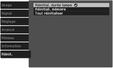 - Sélectionnez Réinitial. durée lampe, puis appuyez sur Enter. Une invite vous demande si vous voulez remettre à zéro les heures de la lampe.