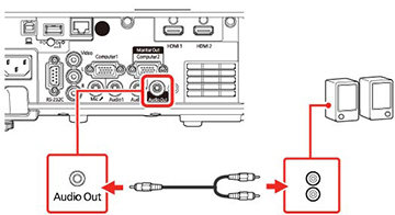 Vous pouvez connecter le projecteur à des haut-parleurs auto-alimentés externes et contrôler le volume en utilisant la télécommande du projecteur.Vous pouvez aussi brancher le projecteur à un amplificateur avec des haut-parleurs.