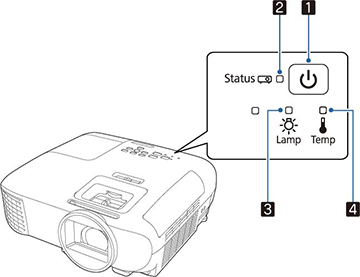 1 Témoin d'alimentation 2 Témoin d'état 3 Témoin Lamp 4 Témoin Temp Témoin d'alimentation Témoin d'état Témoin Lamp Témoin Temp État et solution Bleu Bleu Éteint Éteint Fonctionnement normal. Bleu Clignotant bleu Éteint Éteint Réchauffage ou refroidissement du projecteur en cours Clignotant bleu Varie Éteint Clignotant orange Le projecteur est trop chaud. - Vérifiez si les évents et le filtre à air sont obstrués par de la poussière ou par des objets à proximité.