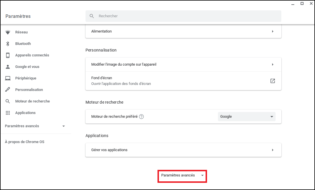 Faites défiler vers le bas de l’écran Paramètres, puis cliquez sur Paramètres avancés.